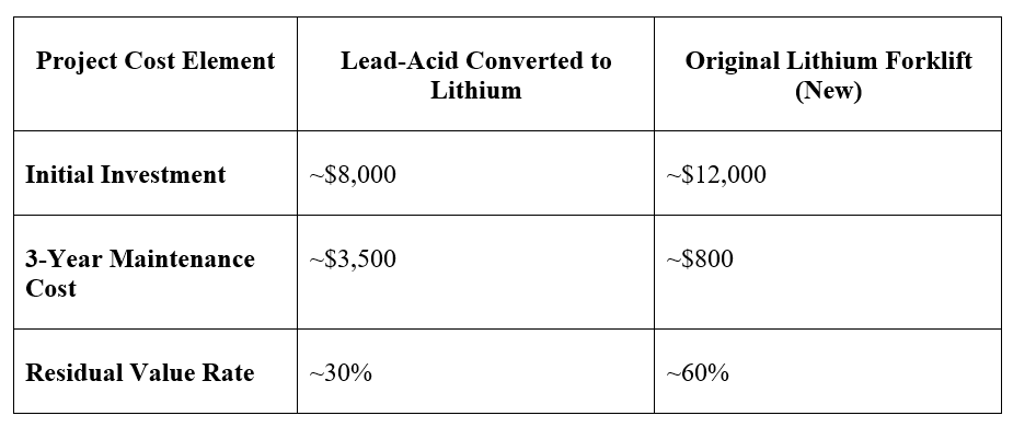 This comparison points towards a practical guideline: Conversion tends to be most financially viable for older forklifts that are already nearing retirement (say, within the next 3 years or so). For these machines, minimizing the upfront cost makes sense because you won't be holding onto them long enough for the low residual value to sting badly. If you need a machine for the longer haul, investing in a new, integrated lithium forklift often presents better overall economic value.