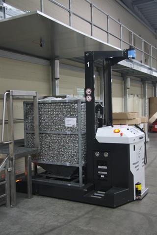 The AGVs are used for conveying empty containers to a filling station and collecting them once the production machines have filled them. Each machine currently produces between 3,000 and 5,000 crown corks per minute. A cage or octabin takes between 330,000 and 370,000 corks. This means that each AGV can collect up to a ton of materials from the filling station.