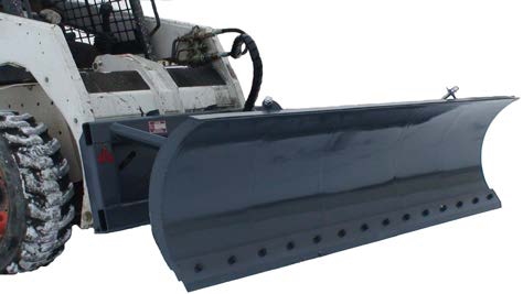 heavy duty snow removal attachments for skid steer and tractor loaders. The Heavy Duty snow blade angles left or right 30 degrees and features a heavy duty 3000 psi angle cylinder. The moldboard is 84" wide, 21" high and 1/8" thick. It is equipped with standard adjustable/removable shoes, includes standard universal skid steer hitch plates, and is also available in a fork mounted model.