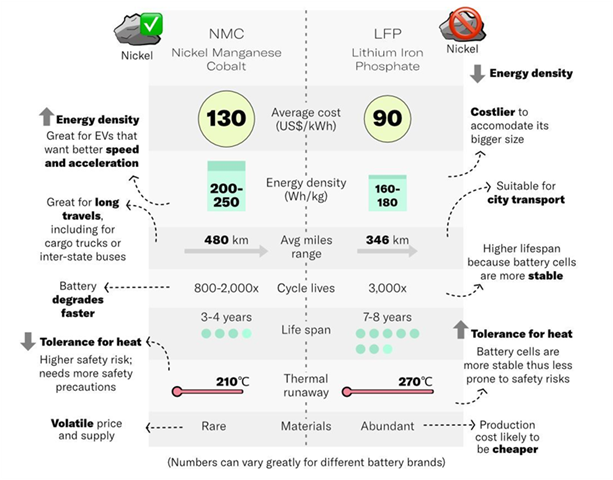 LFP battery components are less expensive than NMC components. Nickel and cobalt are expensive and are often associated with unethical mining practices.
