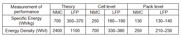 Theoretical calculations suggest that NMC chemistry has at least twice the specific energy and energy density of LFP chemistry. However, on the cell level, NMC only outperforms LFP by a factor of 1.5 on these parameters, and at the pack level, the two chemistries perform similarly.