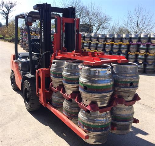 The customised new keg clamp attachment fitted to a Toyota truck allows for 12 barrels to be handled in a single lift. It enables a secure grip of kegs and casks and provides ease of movement in the height-restricted area for handling both full and empty barrels.