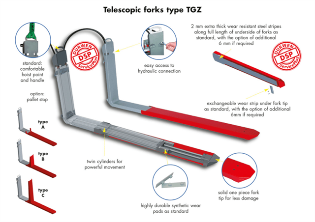 We offer a variety of different combinations and options, including combining the telescopic forks with a fork positioner, either bolted or hooked-on. At Durwen, we have many engineers and technicians, therefore, we are able to manufacture any type of combination/special option.