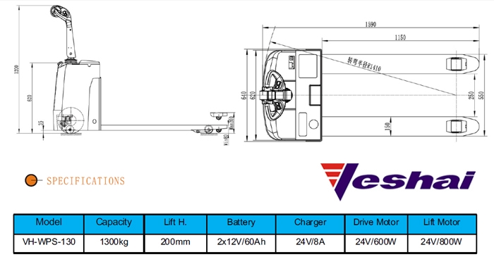 The Veshai WPS130 is the entry model for the electric powered range of pedestrian pallet trucks - for the accelerated transport of loads and pallets with minimal effort.With its small size, the WPS is ideal for shunting loads in confined areas. The support rollers alongside the drive wheel provide additional stability.