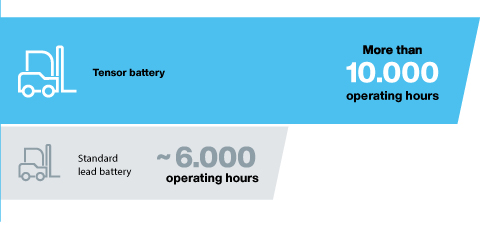 Forklifts can run for considerably longer when powered with these advanced lead batteries – more than 10,000 operating hours, in fact – and can be fully recharged from 80% depth of discharge in just four hours. They are therefore ideal for multi-shift operations. This is thanks to Tensor’s unique charge acceptance, which also contributes to lower operating temperatures.