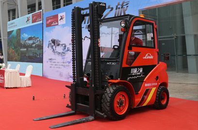 The forklift, nicknamed Linde Challenger HT30, withstood the tests of the harsh climate and tough climbs up mountains at the end of the Tibet Rally. |