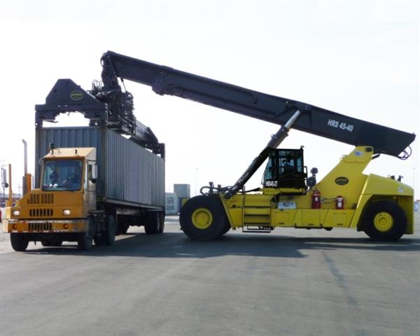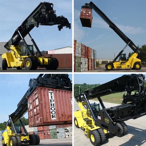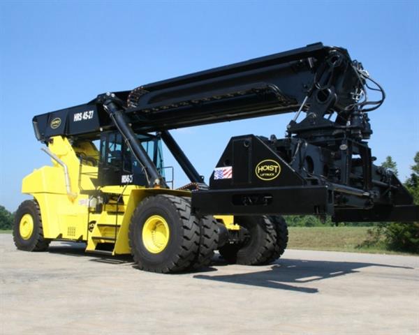 Hoist Liftruck offers five capacities for the most demanding port and rail applications (HRS-45-27, HRS-45-31, HRS-45-33, HRS-45-35, HRS-45-40). The Reachstacker features standard premium components from only the best suppliers including Cummins Engines, Dana Transmissions and Axle Tech drive axles. The Reachstacker has a modular design for exceptional service access, easy transport, and quick assembly time. The spacious operator compartment hydraulically extends and retracts, providing instant access to the drive line and hydraulic systems. A luxury air-ride seat with a single joystick control provides precise handling and comfort.