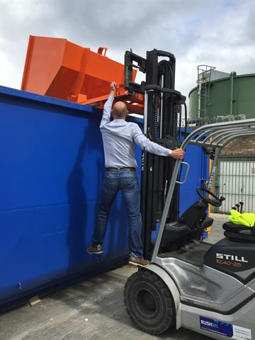 "Most skips carried by forklifts require a forward-tipping action to unload, but the height and design of these super-sized skips often sees operators standing on mud guards or climbing the side of the yard skip to reach the release mechanism," he explains