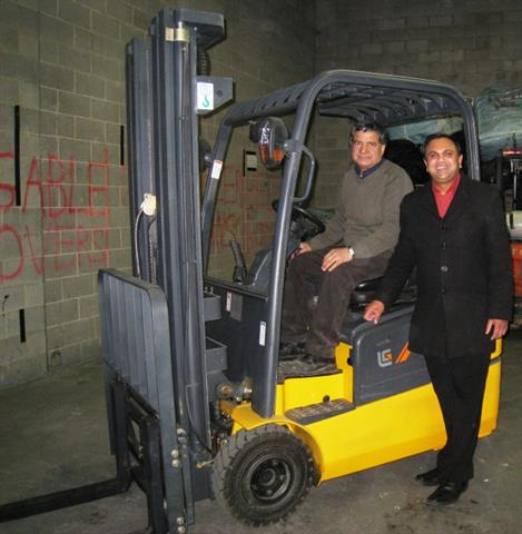 | CSL Equipment's first customer to purchase a LiuGong forklift (LiuGong model CLG2015AT 3-wheel electric truck). Seated is Randy Johal of Crowfoot Bottle Depot in Calgary, Alberta. Standing is Sarath Wattegama, Sales Manager for CSL Equipment. |