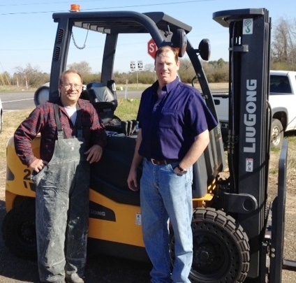 LiuGong 2025H LPG sold to Patrick Construction. Standing (L to R): Johnny Patrick of Patrick Construction, Scott Malmstrom of Lift Truck Supply.