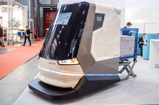 German Serva Transport Systems, known for its Ray automatic parking drone, premiered a second product - EVE (Efficient Variable Ergonomic). EVE is a most elegant AGV that forms part of a total concept. When a forklift unloads a trailer, it drops the pallets onto the Ergoporter, an ergonomic 0.5 m high stand that carriers up to 1 T. EVE 'swallows' the Ergoporter and the pallet and brings them into the warehouse and later to the production/assembly floor at a speed of 1.6 m/s. EVE is operational at crane builder Palfinger AG.