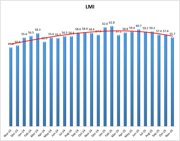 The Logistics Manager’s Index (LMI) dropped 1.7 points in November to sit at 55.7, the lowest it has been since June 2024, and is the ninth consecutive month to come in below the all-time overall average of 61.4.