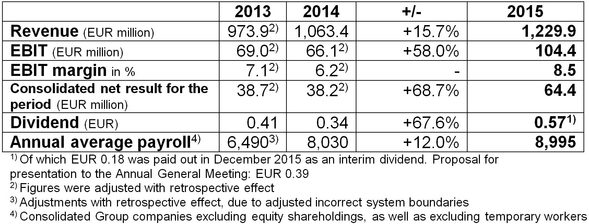 Revenue rose by 15.7% from EUR1,063.4 million in 2014 (USD1,191.53 million) to EUR1,229.9 million (USD 1,378.10 million), a new record level. EBIT showed an extraordinary increase of 58%, while the consolidated net result for 2015 was 68.7% higher than the previous year's figure.