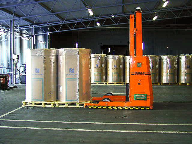 Rocla received an order from Borealis which consisted of 10 AGVs. In 2003 Borealis added 4 new AGVs to the existing system. The 14 Rocla AGVs are transporting octabins from production to the storage and from the storage to dispatch area for lorries. An octabin is a special container - it is an eight edged cardboard cylinder placed on a pallet, approximately 1100x1100x1800 mm with a weight of 800 kg. The octabin is filled with polyethylene granulate. The storage is a buffer store for different production batches. There are two different parts in the storage: the largest part contains normal catalytic processed polyethylene and the smaller part for PEX, the super clean polyethylene. PEX needs to be stored in normal temperature so this part of the storage is heated wintertime.