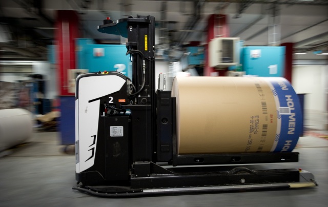 AGV technology - automated trucks do not call in sick or have bad days - and its precision, which eliminates the risk of damage to the 1.5 tonne newsprint paper rolls.