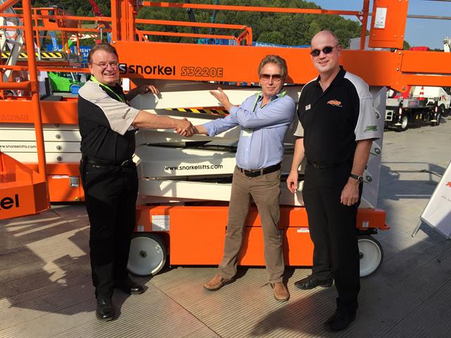 The first order for the new lifts was received at Platformers' Days 2015 from Buchtmann Arbeitsbühnen GmbH. Company owner Willi Buchtmann placed an order with Bernhard Kahn of Ahern Deutschland for 10 of the new S3220E electric slab scissor lifts, along with five of the S3219E models.
