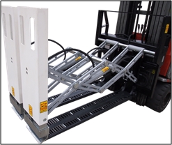 Since the introduction of the ROLLERFORKS® in 2003 at Logistica in Utrecht, MSE-FORKS has built up a huge customer base of many satisfied ROLLERFORKS® users in the food industry, the chemical industry, third party logistics and many other segments. By now, many multinationals are using the patented ROLLERFORKS®, but many SMEs do so as well, because of the small investment compared to other slip sheet tools.ROLLERFORKS®-Lifter Slip Sheet unit | Nevertheless, MSE-FORKS decided to develop more slip sheet attachments alongside the ROLLERFORKS®. In practice, specifically, it appears that ROLLERFORKS® generally have difficulty stacking or splitting goods on slip sheets. To ensure that customers using slip sheets are also able to stack loads, MSE-FORKS® has developed the ROLLERFORKS® Push/Pull. This combination, also patented, can handle both pallets and slip sheets. The lateral adjustment of the forks enables pallets and slip sheets of varying widths to be lifted with proper adequate stability. The upper load is lifted by the Push/Pull mechanism |
