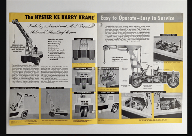 Here's an original brochure for the Hyster KE Karry Krane manufactured from 1956, shared by Hyster Europe on their Twitter page. ‘Styled by Henry Dreyfuss’ Hyster proclaimed it to be ‘the industries newest and most versatile materials handling crane.’