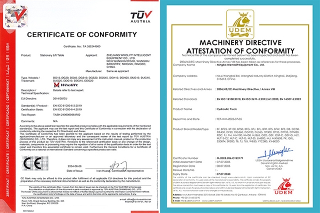 Your operators' safety is our non-negotiable priority. We firmly believe that safe operation is the foundation of a productive operation. This is why every single Wemalift product is rigorously tested and certified to meet CE requirements. This European Conformity mark is your assurance that our equipment complies with the strictest health, safety, and environmental protection standards. From emergency lowerings and safety gates on our scissor lifts to overload protection on our pallet stackers, our designs are infused with protective features that provide peace of mind.